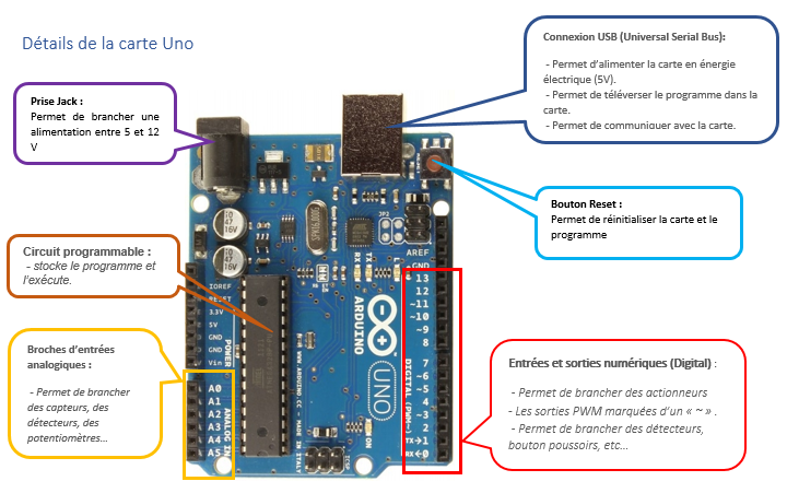 Chacun des connecteurs D0 à D13 peut être configuré par programmation en entrée ou en sortie. Les signaux véhiculés par ces connecteurs sont des signaux logiques, c'est-à-dire qu'ils ne peuvent prendre que deux états HAUT (5 Volts) ou BAS (0 Volt). En entrées, toutes les valeurs inférieures à 5 volts sont considérées comme un niveau BAS donc (0 Volt). En Sorties, quand elle est active donc à l'état HAUT, la tension de sorties ne peut pas dépasser 5 Volts. En pratique, les connecteurs D0 et D1 réservés pour la liaison série asynchrone (port COM virtuel via le câble USB) ne sont pas exploités pour d'autres utilisations. À noter que chacun des connecteurs ne peut fournir ou absorber un courant supérieur à 40 mA environ (200 mA pour l'ensemble des connecteurs). Certains connecteurs peuvent être spécialisés comme sorties PWM (repérées par un ~) |